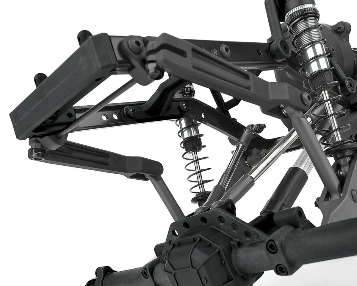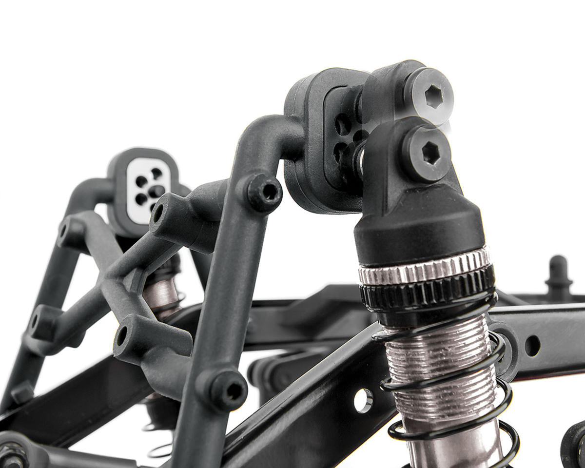 Built on Element RC's proven stamped steel C-channel chassis this truck features the Gatekeeper Suspension package (GKS) with rear trailing arms that move the shocks forward. This allows for a larger shock tuning window and improves weight bias. The trailing arms are paired with a rear anti-roll bar for a more stable and consistent suspension when crawling on the rocks. An adjustable aluminum track bar mount firmly bolted to the chassis rail gives the Enduro Ecto more reliable and responsive steering without the flex. Shock mount inserts offer multiple mounting positions to allow for precise suspension tuning, whether moving the shocks up, down, forward, or back.