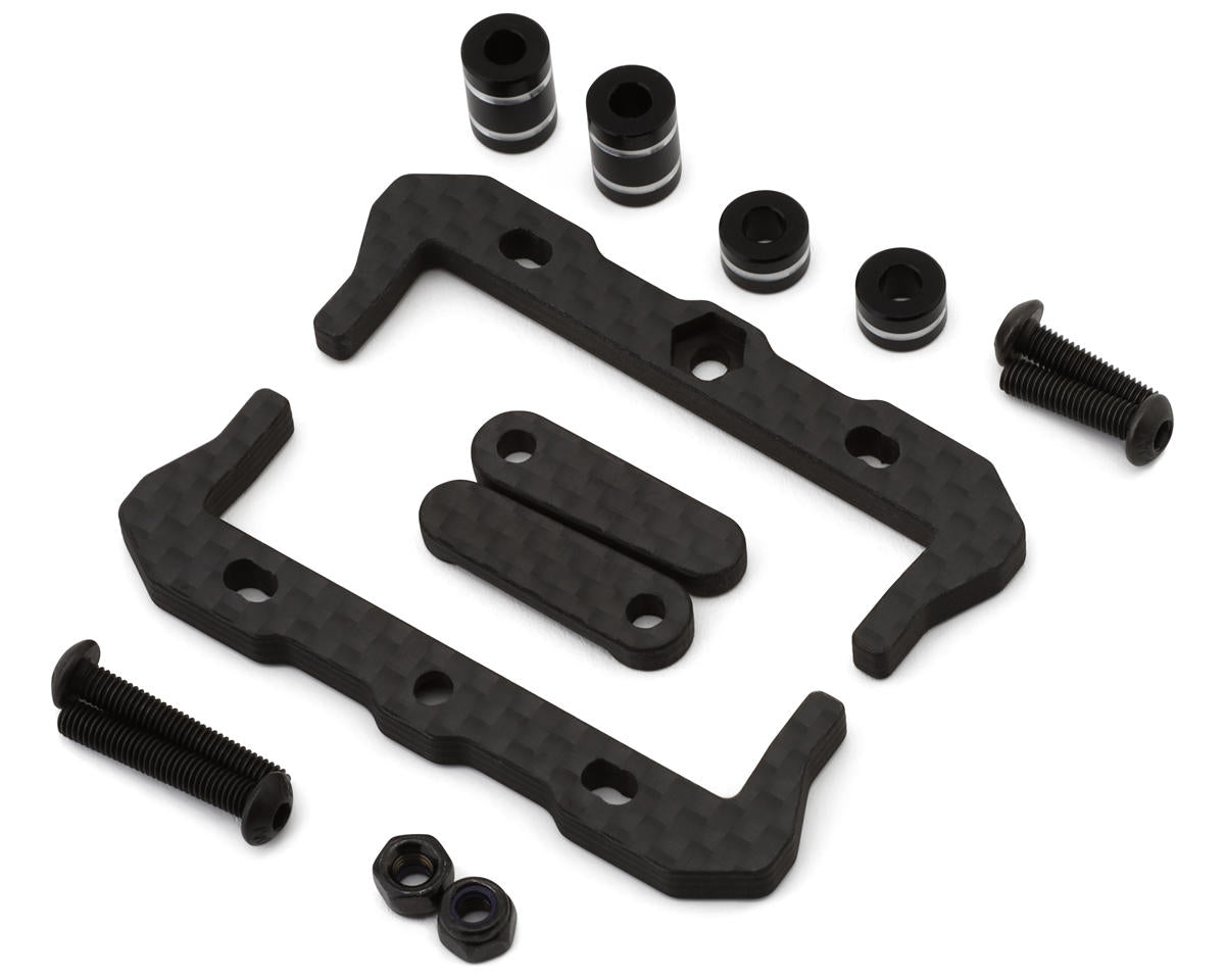 This is the Associated B7 Adjustable Carbon Fiber Battery Hold Down Kit from J&T Bearing Co. This premium kit is designed to securely hold your battery while optimizing the center of gravity and reducing overall weight for enhanced performance.