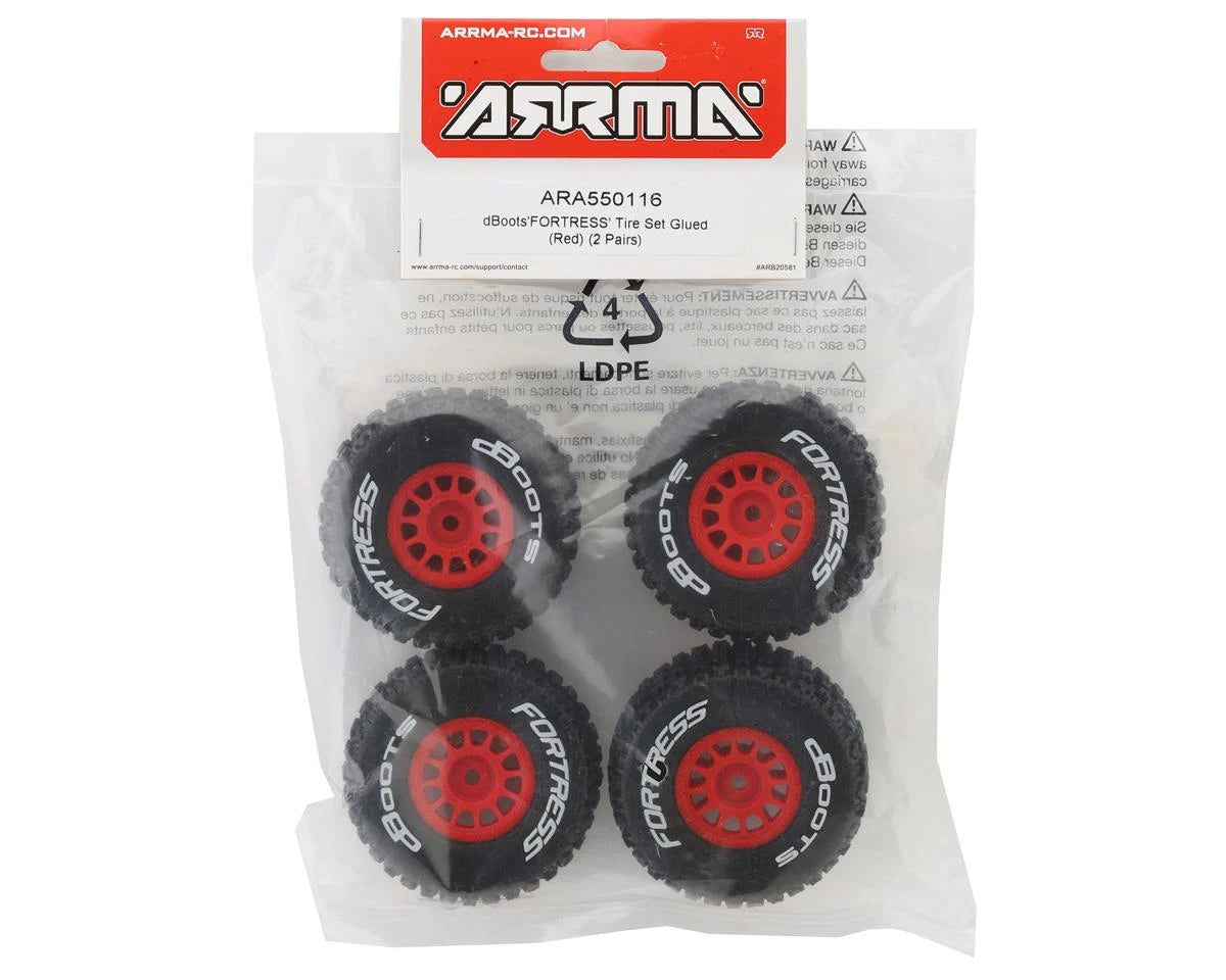 Arrma dBoots 'Fortress' 1/18 Pre-Mounted Off-Road Tire Set. This is a replacement wheel set intended for the 1/18 Arrma Mojave. Package includes four pre-mounted tires.