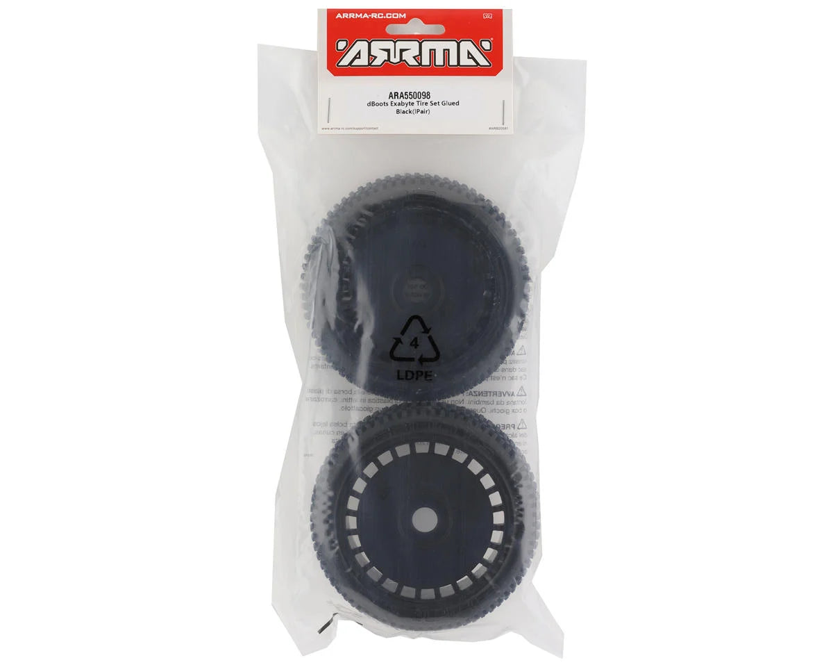 The Arrma Pre-Mounted DBoots Exabyte Tires. These replacement tires are intended to be used with the Arrma TLR Tuned Typhon. Package includes two pre-mounted tires.