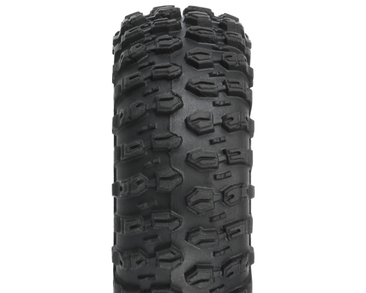 Pro-Line Axial SCX24 1.0" Hyrax Pre-Mounted Tires are designed to provide maximum grip on whatever terrain your SCX24 attempts to tackle. The Hyrax features an aggressive and open tread pattern with each tread block containing Sipes for additional tread flex. The highly detailed connected tread on the sidewall of the Hyrax extends out for unmatched side-hilling performance. The Hyrax also features futuristic stepped tread blocks that create even more forward gripping edges that dig into slick rock like no other mini tire produced to date! The Hyrax 1.0" tires are made from a super soft compound to help your SCX24™ climb to new heights and the tires are supported with soft foam inserts. The Hyrax 1.0" tires come in at an overall height of 2.10" and a width of 0.75".