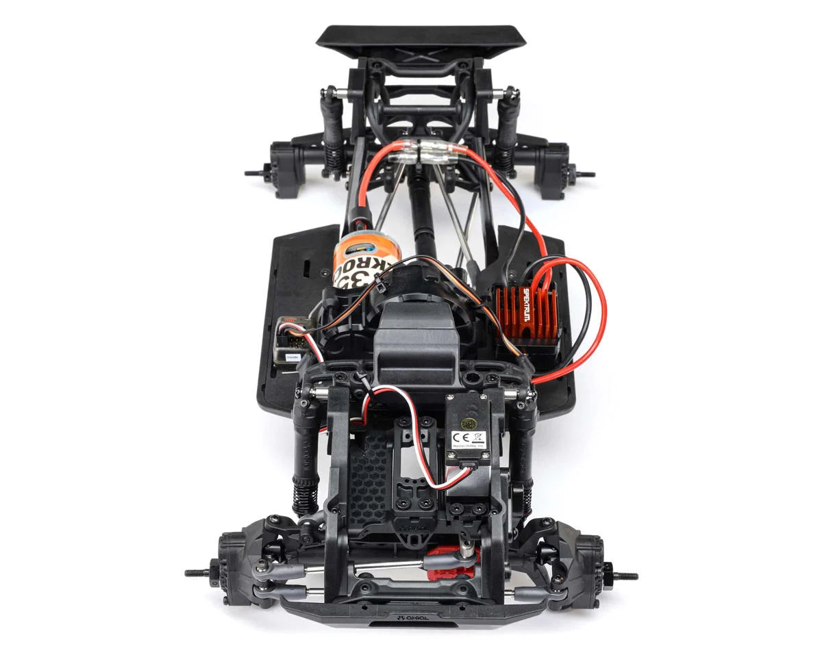 The Coyote’s factory-installed brushed power system features a 35T Axial 540 motor and waterproof Spektrum 40A ESC. A metal geared Spektrum S664 servo is included for strong, dependable steering. The included Spektrum SLT2 transmitter is designed to help all drivers succeed on the trails. Its throttle limiting feature can limit the rig's maximum available speed to 50% or 75% until you're ready for it all. Four AA batteries are included.