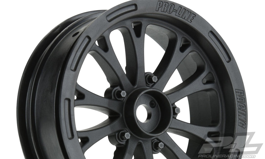 This is a pair of Pomona Drag Spec 2.2" Black Front Wheels. Do you need high-performance and perfectly styled drag wheels for your no-prep SC Drag Car? Pro-Line has you covered with the all-new Pomona Drag Spec 2.2" Black front Wheels! The Pomona wheels were specifically made for no-prep Drag racing and are a perfect fit with Pro-Line's! The Pomona wheels are strong and lightweight 12mm hex wheels making them the ideal choice for performance drag racing. The wheel spoke design mimics what you would find at the Pomona Drag Strip on any given race weekend and will complete the look of your build. The Pomona wheel offset is ideal for the Losi® 22S™ No Prep Drag Car, 2wd Slashes converted to no-prep Drag Racing cars and AE DR10, which has exploded in popularity. The Pomona Drag Spec wheel and every other wheel that Pro-Line makes is proudly Made in USA. Launch your no-prep Dragster to the next level with the Pro-Line Pomona Drag Spec Wheels today!