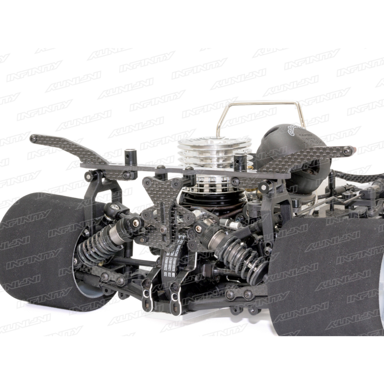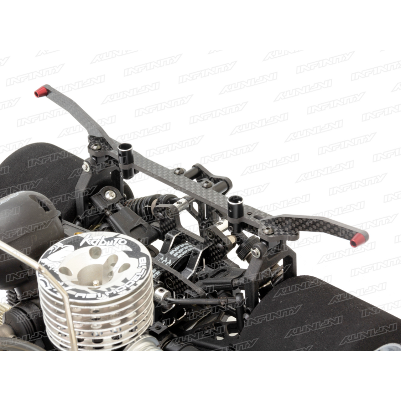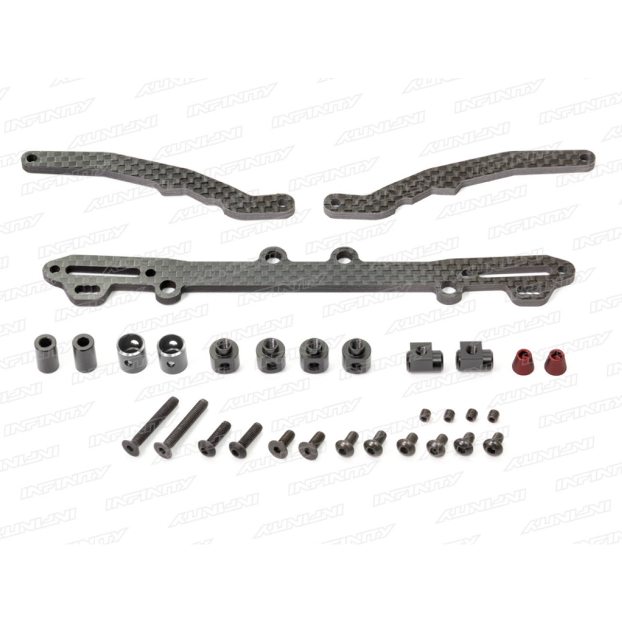 Compared to the standard plastic rear body mount, this new carbon mount increases the height of the body by 3mm (Almost the limit within the regulation of IFMAR). In addition, the cross-sectional shape of the carbon plate and A7075 adapter matches the latest body shapes such as XTREAM's Diablo and Protoform's R19 without any gaps. This allows the downforce to be transferred to the tires without loss and improving rear grip. The left and right carbon plates can be fine-tuned with set screws to accommodate individual body shapes. The connection to the car body can be made in three step width directions, and also absorbs the twisting of the mounting part when toe-in is applied.